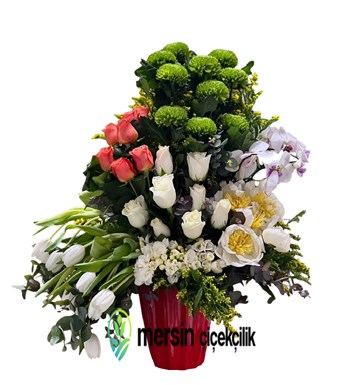 Bu özel tasarım aranjman, Mersin çiçekçilik hizmeti kapsamında profesyonel floristler tarafından özenle hazırlanır. Her bir çiçek taze ve kaliteli olarak seçilir, estetik bir uyumla yerleştirilerek göz alıcı bir kompozisyon oluşturulur. Beyaz güllerin zarafeti, pembe güllerin romantizmi, lalelerin bahar tazeliği ve orkidenin egzotik güzelliği bir araya gelerek bu aranjmanı benzersiz kılar.
