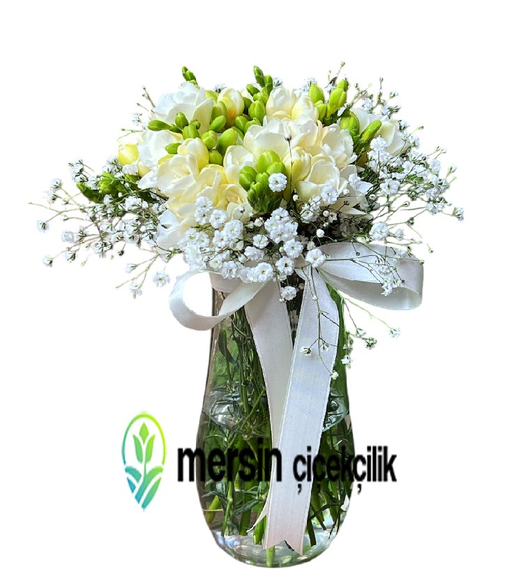 ⏳ Uzun Süre Kalıcılık: Vazo içerisinde düzenlenen beyaz frezyalar, su içinde daha uzun süre tazeliğini korur.