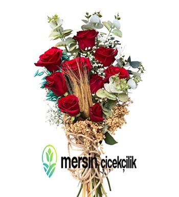 Taze kesim 9 adet kırmızı gül, okaliptus yaprakları, cipso çiçeği, doğal kuru çiçekler ve dekoratif buğday detayları ile harmanlanarak özgün bir buket haline getirilmiştir. Jüt ip bağlama tasarımı sayesinde doğal ve samimi bir görünüm sağlar.