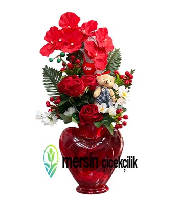 Mersin Çiçekçilik farkıyla sunulan bu özel Kalpten Gelen Aşk Aranjmanı, Akdeniz'in tutkulu aşkını kalıcı bir eserle birleştiriyor. Aranjmanın merkezinde yer alan parlak, cam kırmızı kalp vazo, sonsuz sevginizin garantisidir. Vazoyu süsleyen, canlı görünümlü kırmızı yapay orkideler ve kadife dokulu kırmızı güller, hediyenize lüks bir dokunuş katar. Sevdiklerinize Mersin'de unutulmaz bir jest yapmak için idealdir.