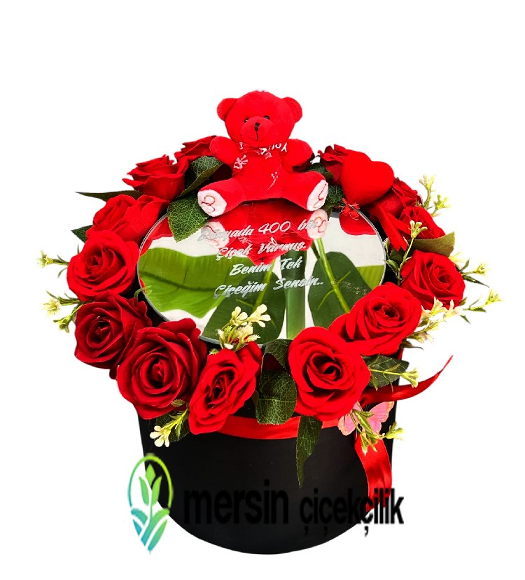 Mersin Çiçekçilik farkıyla sunulan bu eşsiz Kalpten Sözler Gül & Ayıcık Kutusu, sevdiğinize özel ve kalıcı bir anı bırakmak için tasarlandı. Yuvarlak lüks kutu içinde, Akdeniz'in tutkusunu yansıtan canlı görünümlü kırmızı yapay güllerle özenle hazırlanmıştır. Ürünü bölgemizde benzersiz kılan temel özellik ise, ortasında yer alan "Dünyada 400 bin Çiçek Varmış. Benim Tek Çiçeğim Sensin." yazılı kişiye özel pleksi mesaj panelidir.