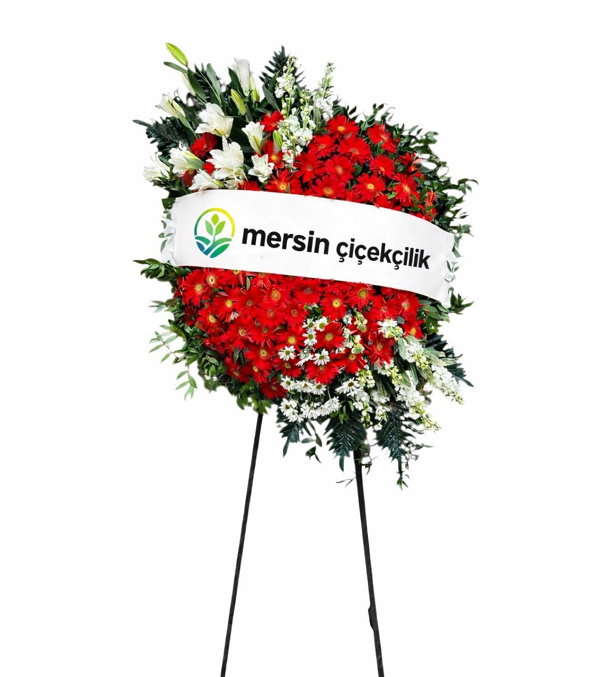Mersin Çiçekçilik güvencesiyle hazırlanan bu özel çelenk; kırmızı gerberalar, beyaz çiçekler ve yoğun yeşilliklerle özenle tasarlanır. Kırmızı renk sevgi ve saygıyı simgelerken, beyaz çiçekler saflığı, huzuru ve sonsuzluğu temsil eder. Bu uyum, cenaze törenleri için en çok tercih edilen kombinlerden biridir.