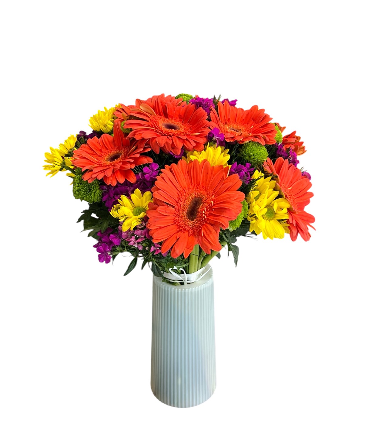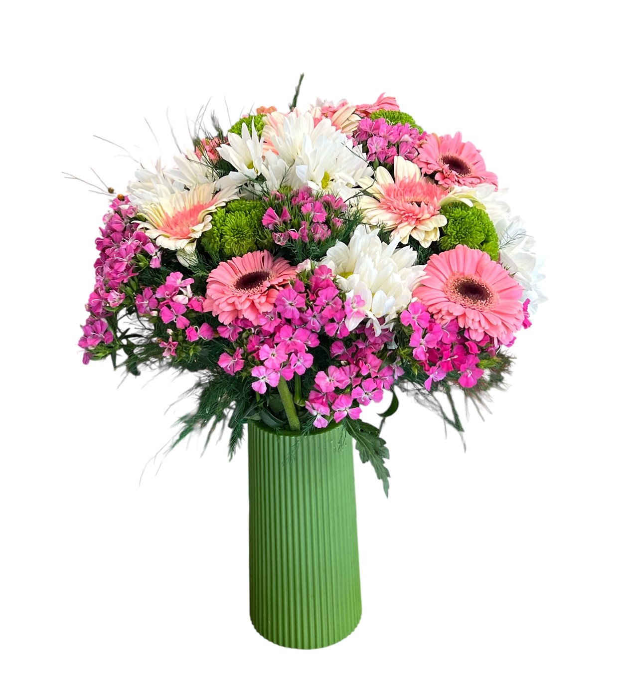 Krem tonlarında şık mika vazo içerisinde hazırlanan Canlı Çiçek Şöleni; pembe gerberalar, parlak sarı krizantemler, canlı yeşil toplar ve mor dolgu çiçeklerinin enerjik uyumunu bir araya getirir. Taze kesilmiş çiçeklerle özenle hazırlanan bu özel aranjman; doğum günü, yıldönümü, teşekkür hediyesi, yeni iş tebriği ya da içten bir sürpriz yapmak istediğiniz her an için zarif ve gösterişli bir seçimdir.