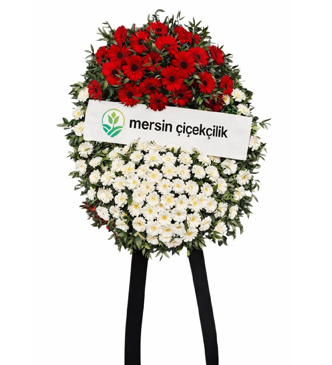 Mersin Çiçekçilik kalitesiyle hazırlanan bu şık çelenk, cenaze törenleri ve anma merasimleri için en çok tercih edilen modeller arasında yer almaktadır.