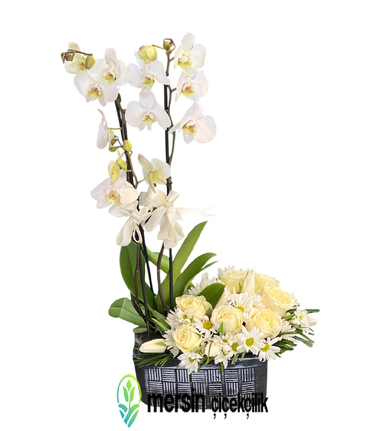 Özel Tasarım Beyaz Orkide Çiçeği, Mersin Çiçekçilik kalitesiyle hazırlanmış, bulunduğu her ortama prestij katan özel bir aranjmandır. Beyaz orkidenin asil duruşu; beyaz güller, papatyalar ve doğal yeşilliklerle bir araya gelerek göz alıcı bir uyum oluşturur.