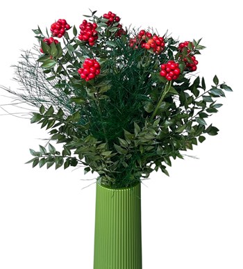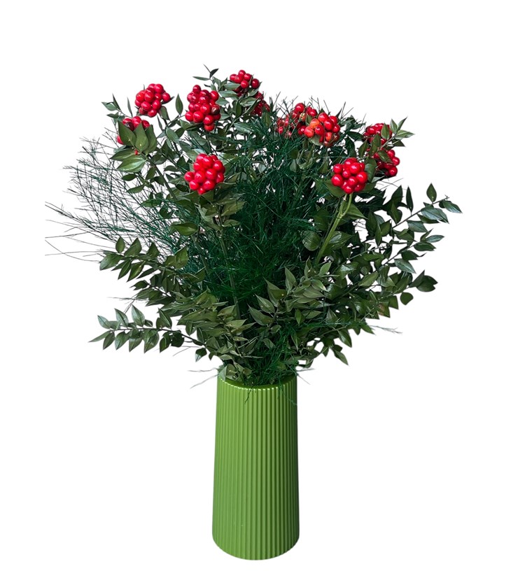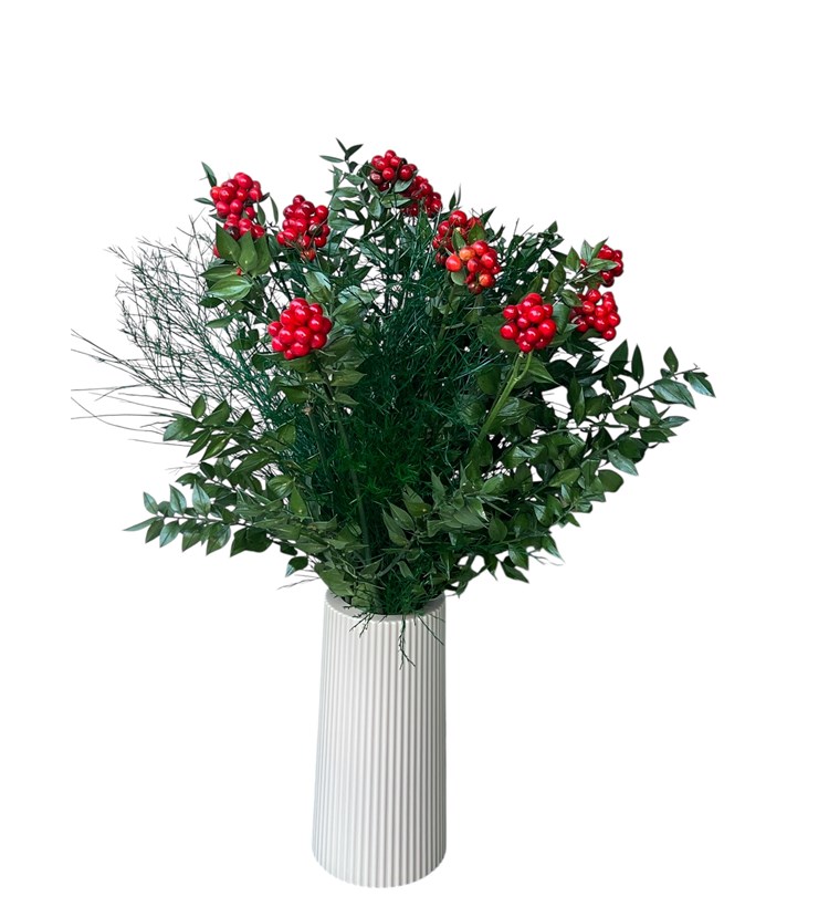 Dekoratif siyah vazo ile bütünleşen canlı kokina dalları, yeni yıl konseptine modern bir yorum katıyor. Kırmızı tonlarının enerjisiyle dikkat çeken tasarım, yılbaşı hediyesi olarak sevdiklerinize şans ve mutluluk dilemenin en zarif yollarından biri. Üstelik bakımı kolay olduğu için uzun süre kullanıma uygun.